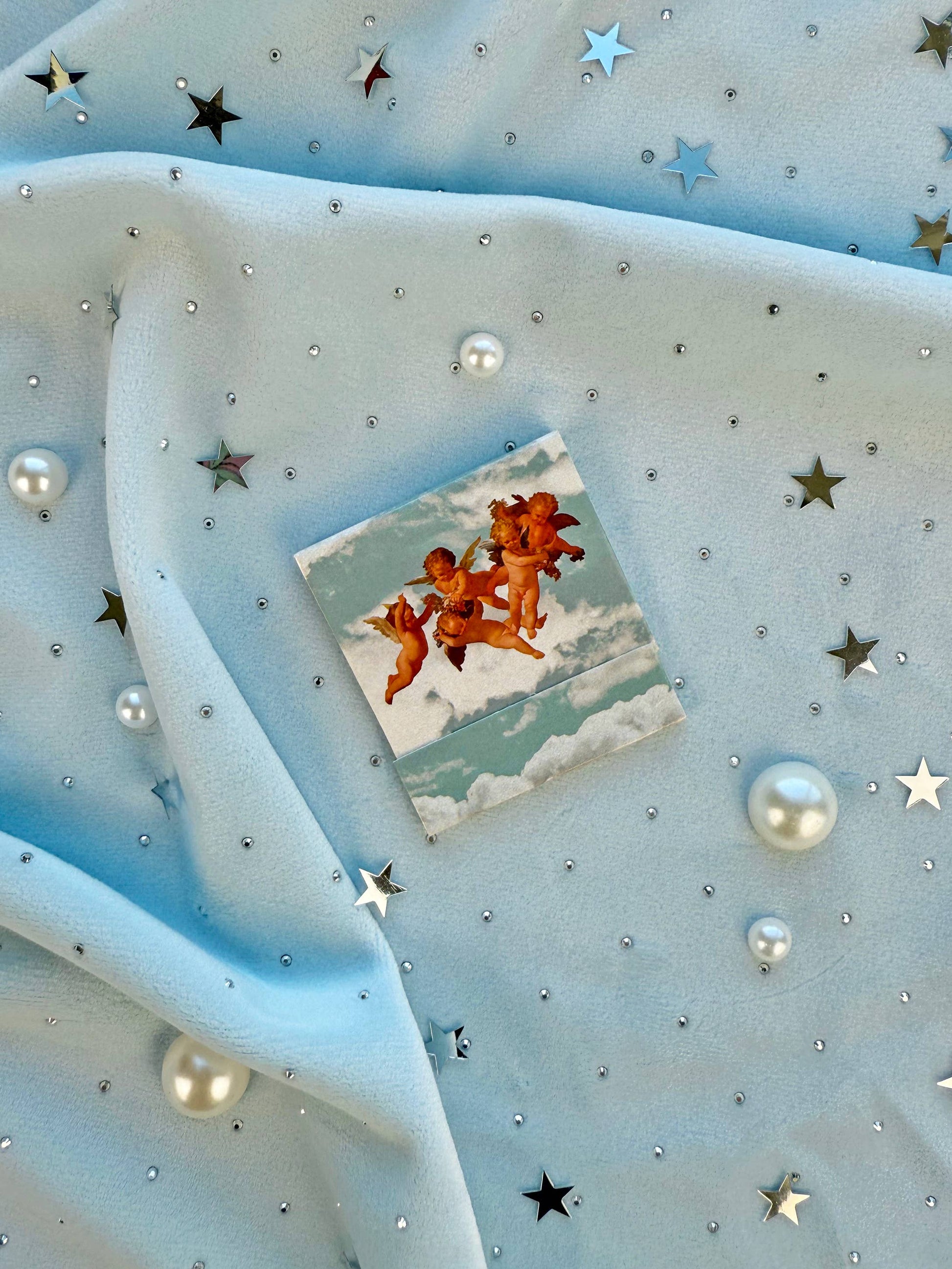 This matchbook fell straight from heaven! This gorgeous Cherub Matchbook features a flight of cherubs against a soft blue sky - whimsical and wonderful! Open the matchbook to uncover 10 periwinkle-tipped matches - each one covered front to back in the same print! Matchbook is 2" x 2.25" Please be careful when using this product and keep away from children! We can not be held liable for any misuse or accidents that occur when using this product.