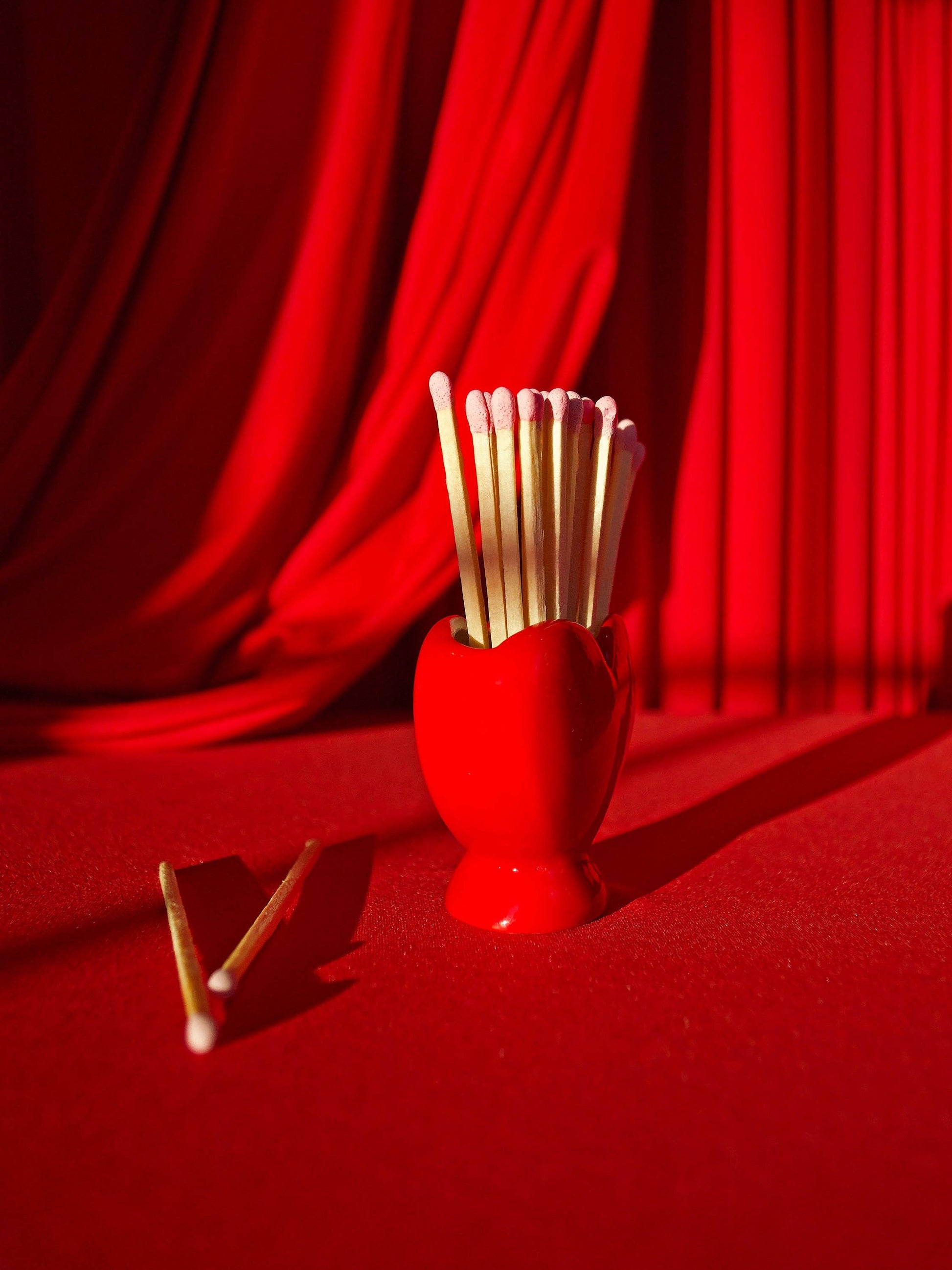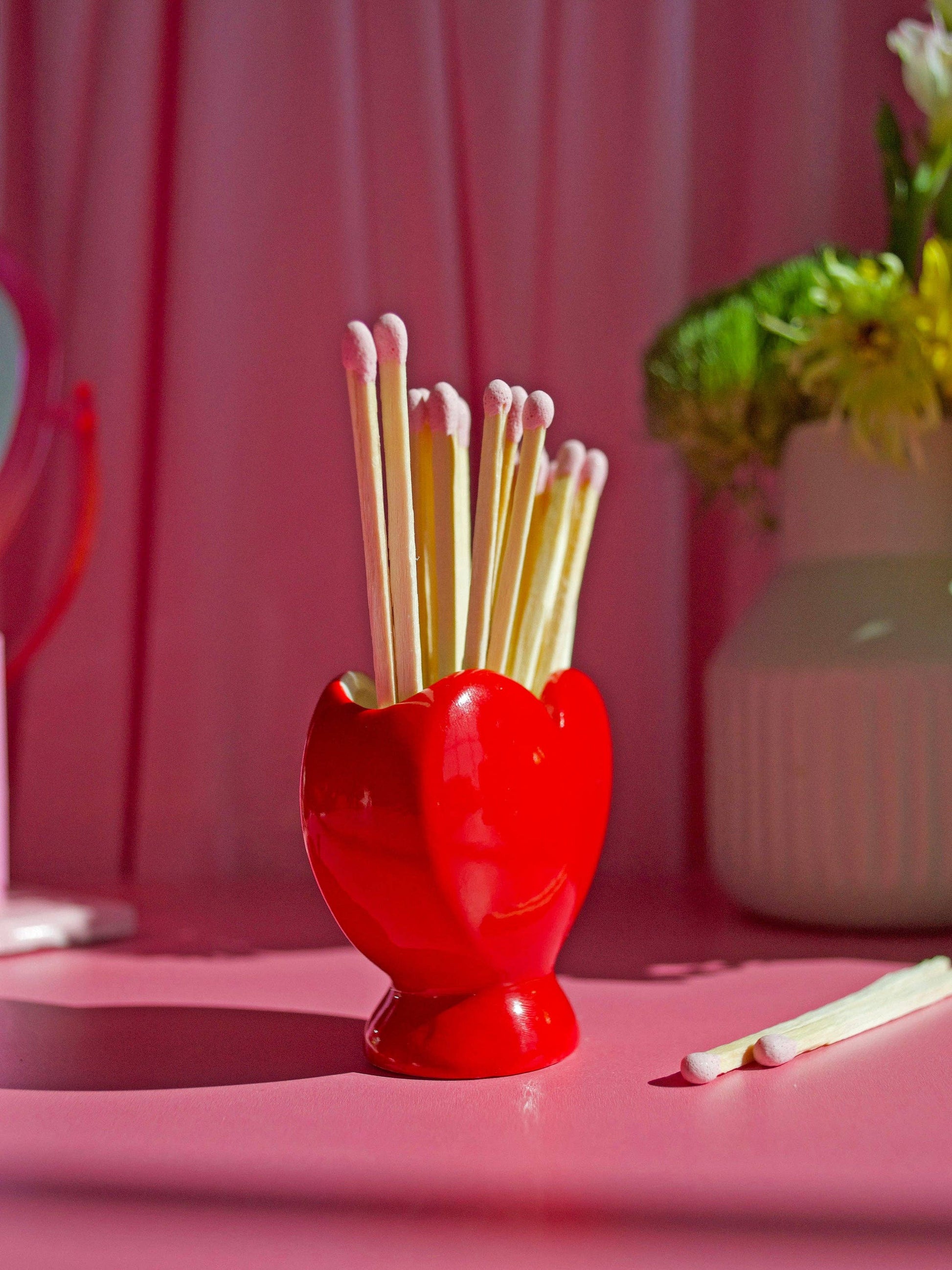 We are a sucker for a heart-shaped anything, and this match striker is no exception! This striker is shaped like the cutest little heart you've ever seen! Comes with 25 matches measuring 3.75" each, stored conveniently inside the heart! When you need a light, tilt it over and strike a match on the base! Looks great on a desk, coffee table, shelf, etc! Also makes a cute tiny vase for tiny flowers :)