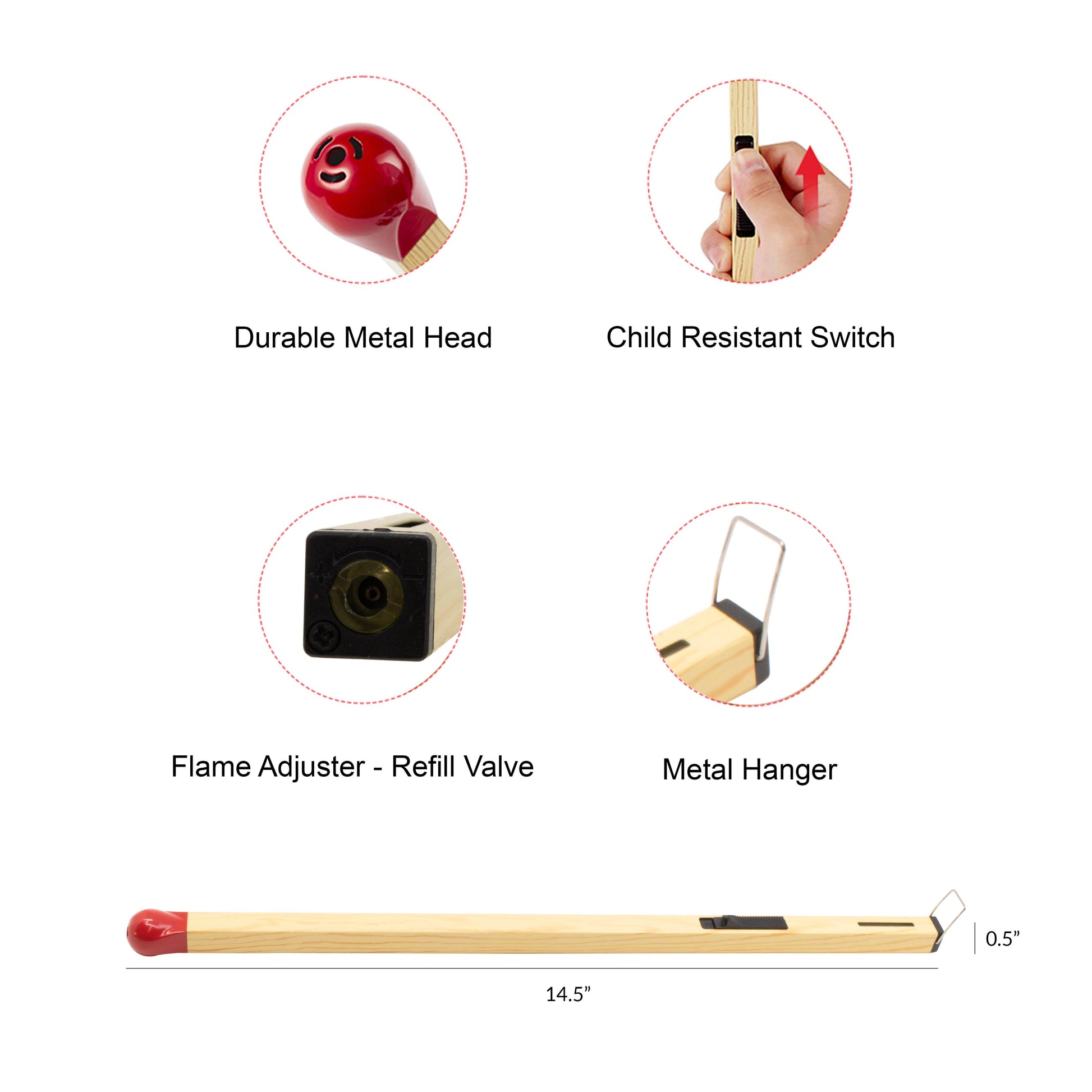 What could be more fun than this oversized match stick lighter? The hottest thing in every way. Lighter may light when you first get it but will absolutely positively need to be filled with butane. Lighter measures 8.5" x .8" Perfect for lighting cigarettes, candles, or whatever else you need a fire for!