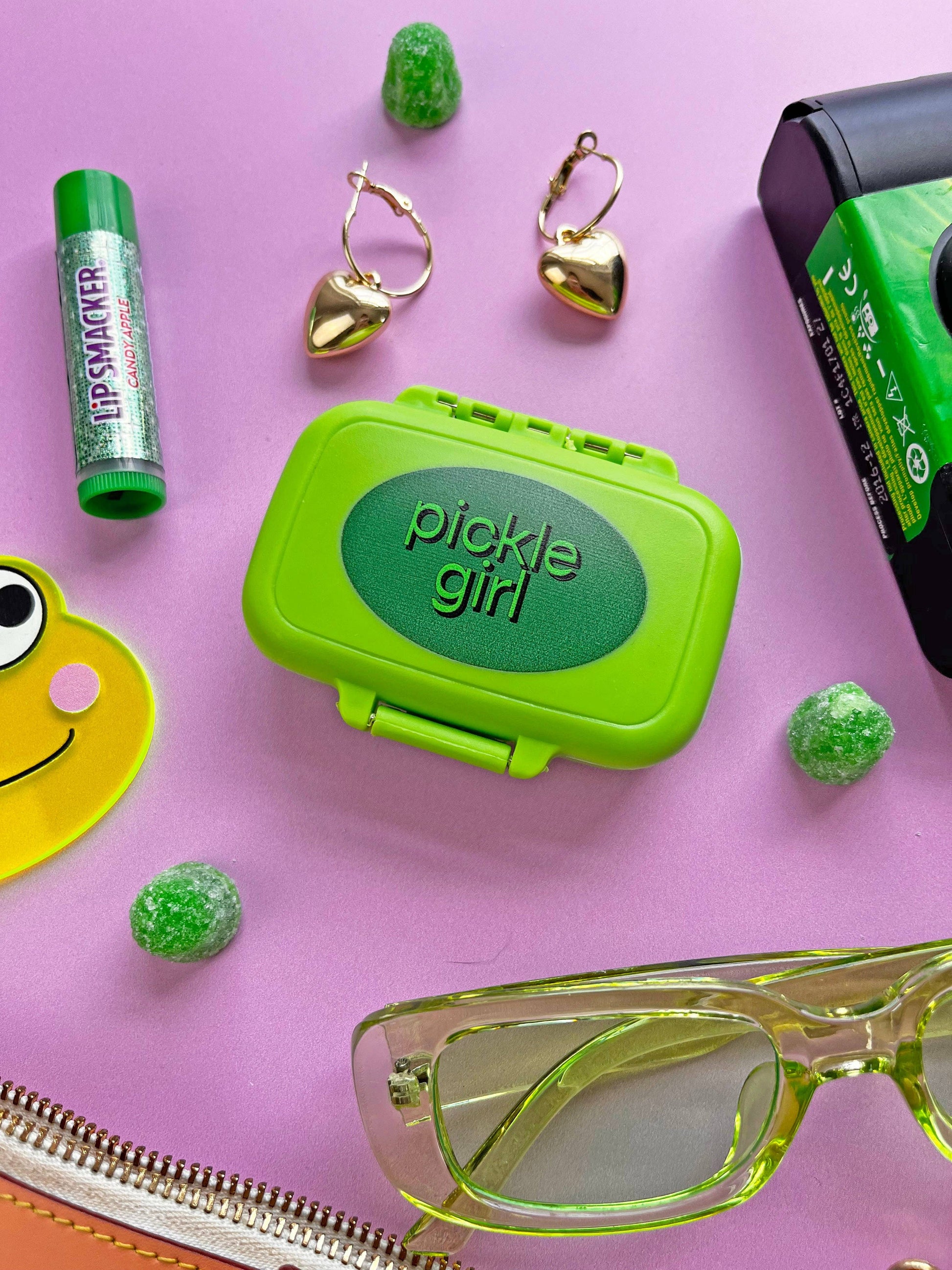 We just had to make a mini portable gherkin suitcase! Or if that's not your thing, maybe put mints in here? Carry your meds and vitamins in style with this green pill case that has two convenient, removable dividers on the inside that creates 3 separate compartments . Shaped like an adorable mini suitcase. Water proof + smell proof!