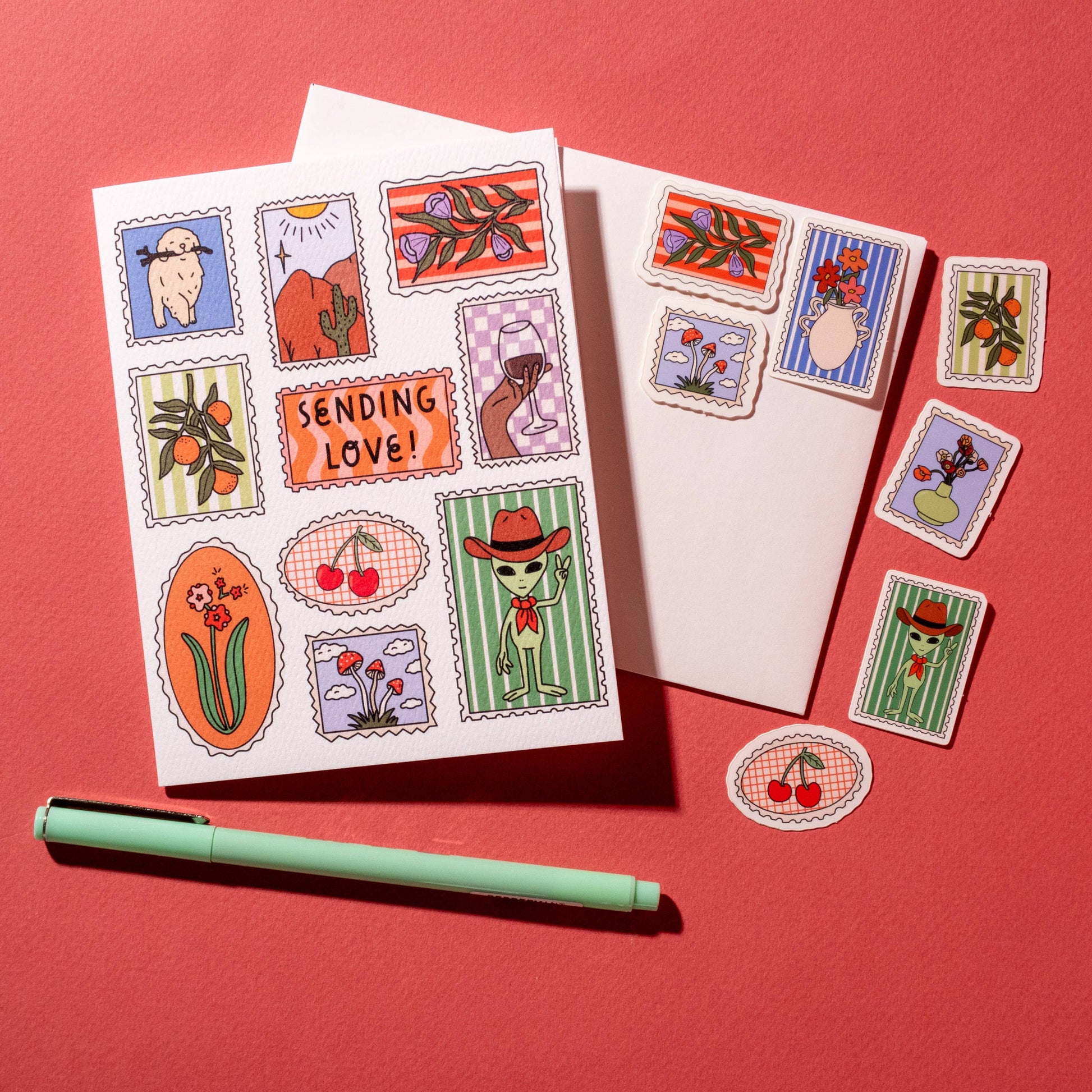 This delightful set features seven beautifully designed, stamp-like stickers that are perfect for adding a whimsical touch to your belongings. The collection includes: Alien Cowboy, Cherries, Flowers in Vases, Mushrooms, Oranges, and Flowers. Perfect for decorating notebooks, scrapbooks, planners, and more, these stickers are a must-have for any sticker enthusiast. Each design captures intricate details and vibrant colors, making them a joy to use and share. Add a touch of personality to your projects with our Stamp Sticker Collection!